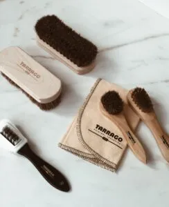- Αν τα σανδάλια σας είναι κατασκευασμένα από σουέτ ή nubuck, μπορείτε να αφαιρέσετε την επιφανειακή σκόνη χρησιμοποιώντας τη βούρτσα Tarrago De Luxe ή τη μεταλλική βούρτσα Tarrago Brass .