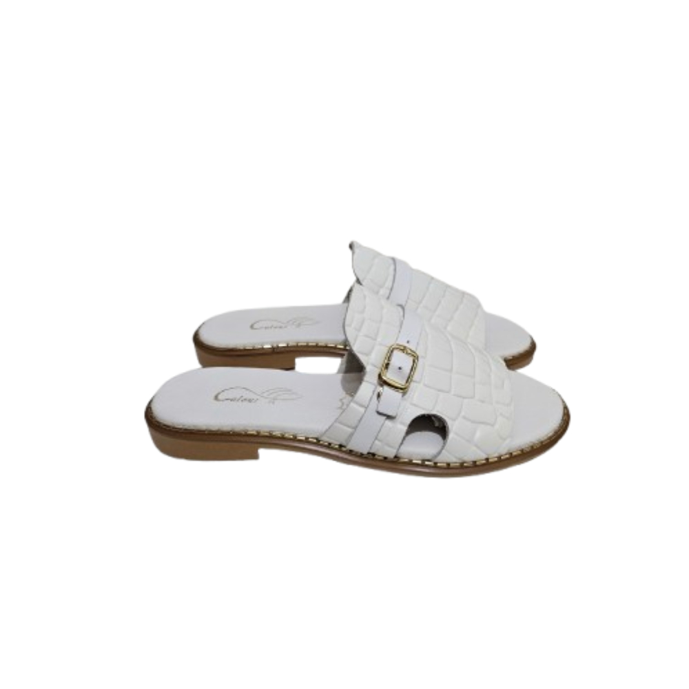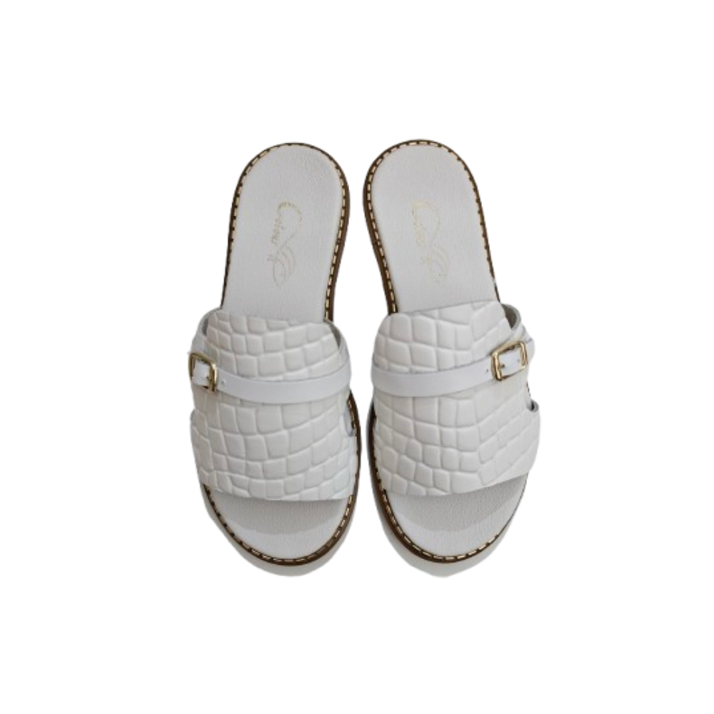 Γυναικεία δερμάτινα σανδάλια κροκό λευκό. Είναι από γνήσιο δέρμα 100% Α΄ ποιότητας. Ελληνικής κατασκευής. Διαθέτει αντιολισθητική σόλα και soft μαξιλαράκι για άνετο πάτημα. Η φόρμα του είναι κανονική και το ύψος τακουνιού 2 εκατοστά. Φάσα στο κουτεπιέ για τέλειο κράτημα. Το δέρμα είναι προσαρμόσιμο και ελαστικό. Αναπνέει και πολύ ανθεκτικό. Τα δερμάτινα σανδάλια δεν φαίνονται μόνο κομψά, αλλά έχουν και εξαιρετική κατασκευή. Τέλεια επιλογή για εντυπωσιακές και στιλάτες εμφανίσεις και άνεση. Χειροποίητη ποιότητα για εσάς. Ανακάλυψε τα!