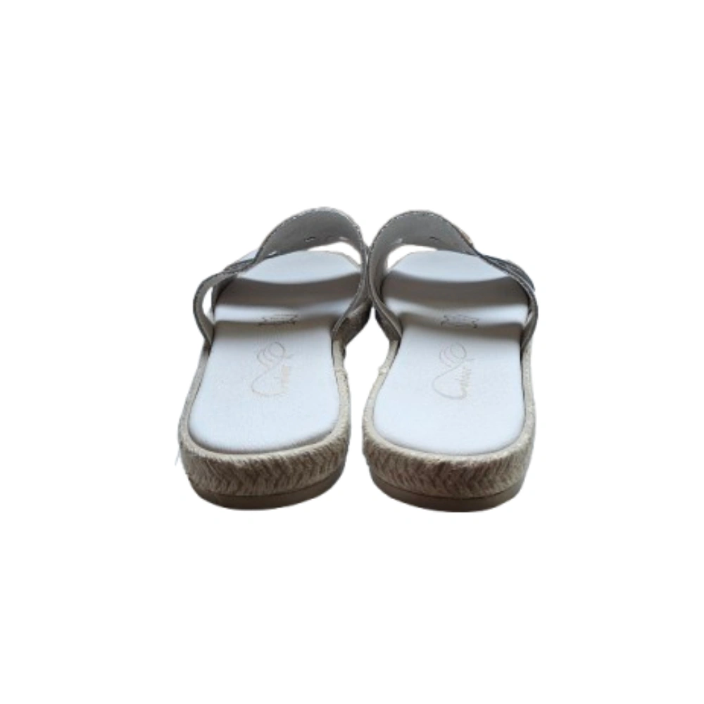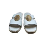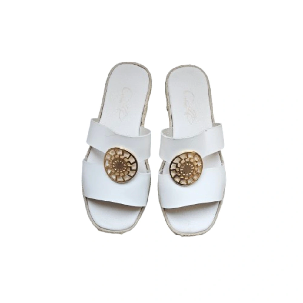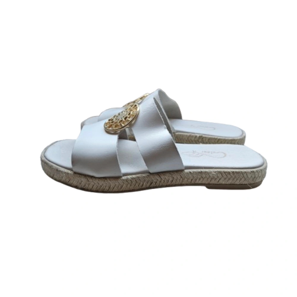 Γυναικεία δερμάτινα σανδάλια λευκό. Είναι από γνήσιο δέρμα 100% Α΄ ποιότητας. Ελληνικής κατασκευής. Διαθέτει αντιολισθητική σόλα και soft μαξιλαράκι για άνετο πάτημα. Η φόρμα του είναι κανονική και το ύψος τακουνιού 2 εκατοστά. Γνήσιο σχοινί εσπαντρίγιας περιμετρικά και μεταλλικά επίχρυσα διακοσμητικά. Φάσα στο κουτεπιέ για τέλειο κράτημα. Κουμπώνει στον αστράγαλο. Το δέρμα είναι προσαρμόσιμο και ελαστικό. Αναπνέει και πολύ ανθεκτικό. Τα δερμάτινα σανδάλια δεν φαίνονται μόνο κομψά, αλλά έχουν και εξαιρετική κατασκευή. Τέλεια επιλογή για εντυπωσιακές και στιλάτες εμφανίσεις και άνεση. Χειροποίητη ποιότητα για εσάς. Ανακάλυψε τα!